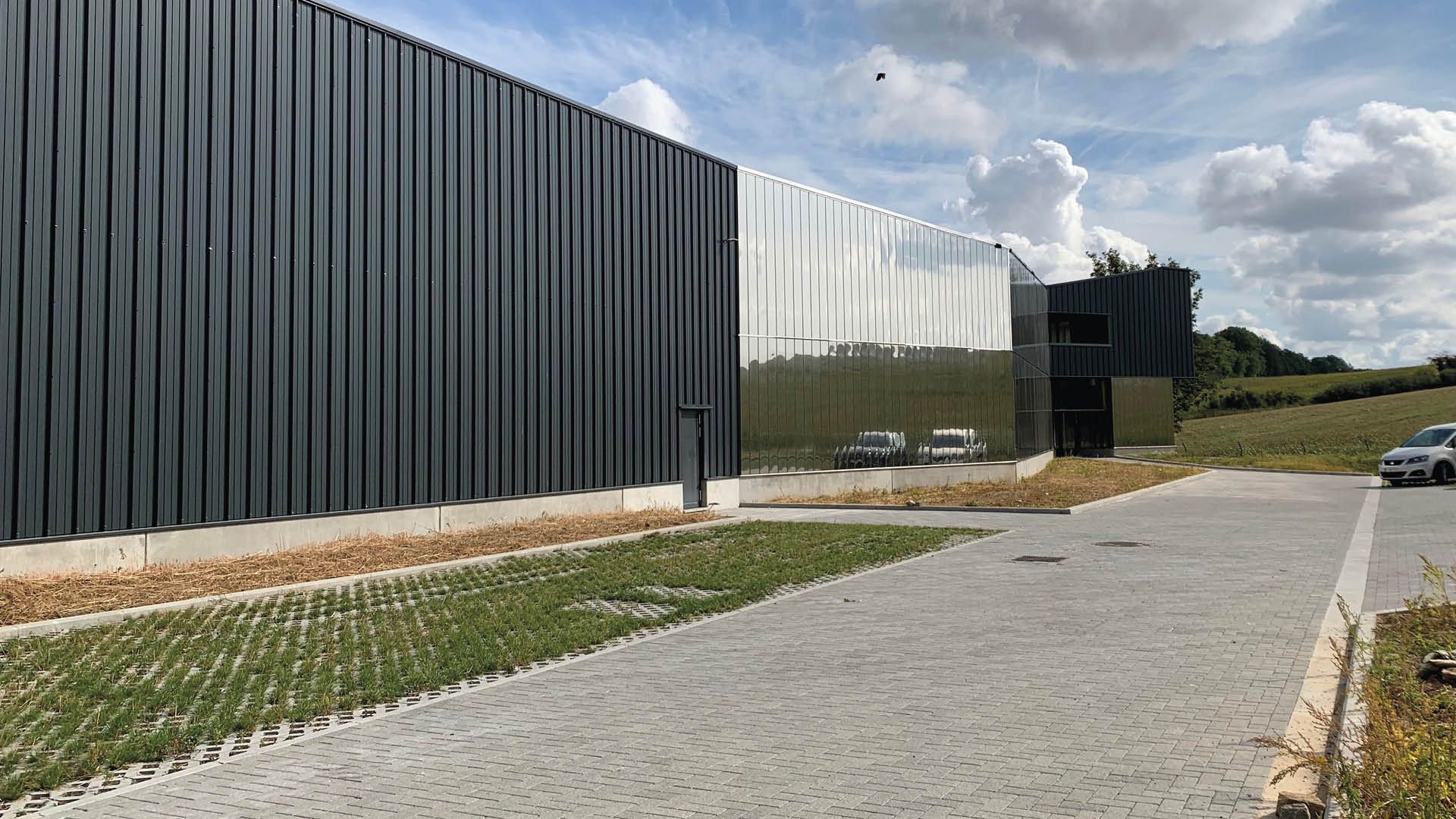 La charpente métallique de 154 t fait écho à la toiture à double pan bien ancrée dans l’environnement. La structure est composée de deux portiques en acier S235 laminé à chaud ayant chacun une portée de 12,5 m, générant différentes toitures sur plus de 100 mètres de long. De là naît un volume anthracite de 22.000 m2 dédié au stockage et à l’entretien des modules lumineux. Une casquette faite d’une structure légère en acier tubulaire à section carrée protège de la surchauffe les occupants des bureaux jouxtant le hall.