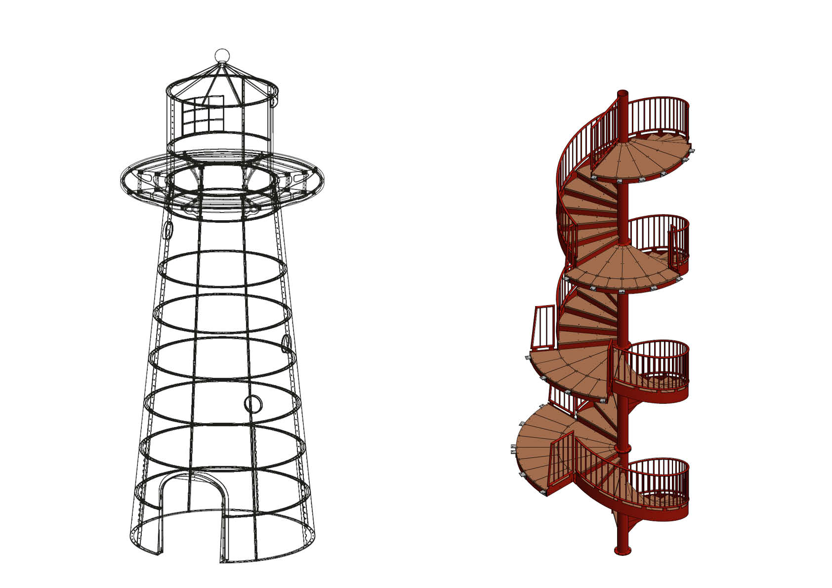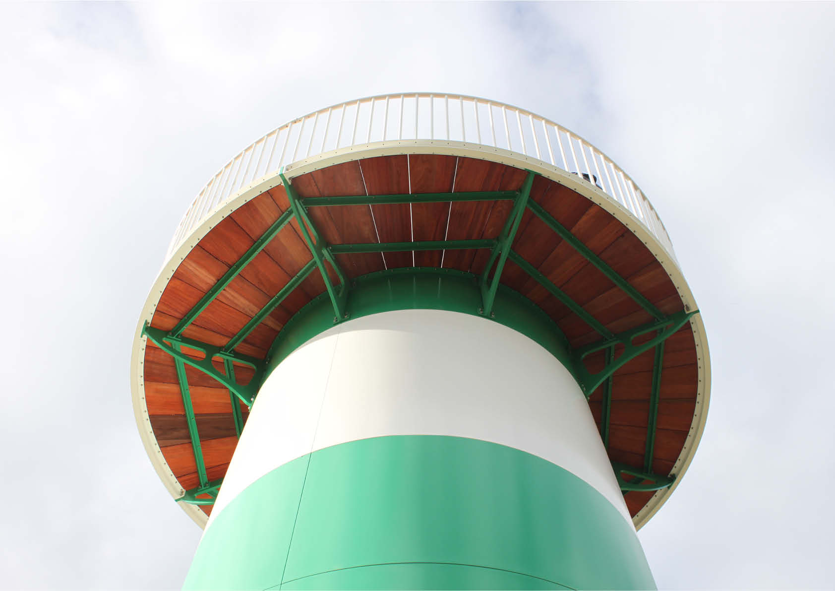 L’enveloppe extérieure construite en caissons d’acier est légèrement conique et supporte la petite maison au sommet et la plateforme d’observation surplombante. Ces caissons sont des quarts coniques en tôle d’acier conçus en atelier, les bords étant soudés sur des bandes de raidissement en acier. Dans les deux caissons inférieurs, les nervures intermédiaires centrales sont soudées dans chaque cas en raison des contraintes dans l’acier et de l’accumulation possible de sable contre la tour. Les nervures verticales font office d’anneaux de traction et, sous la plateforme, d’anneaux de pression. L’escalier central en spirale est stabilisé horizontalement par l’enveloppe extérieure.
