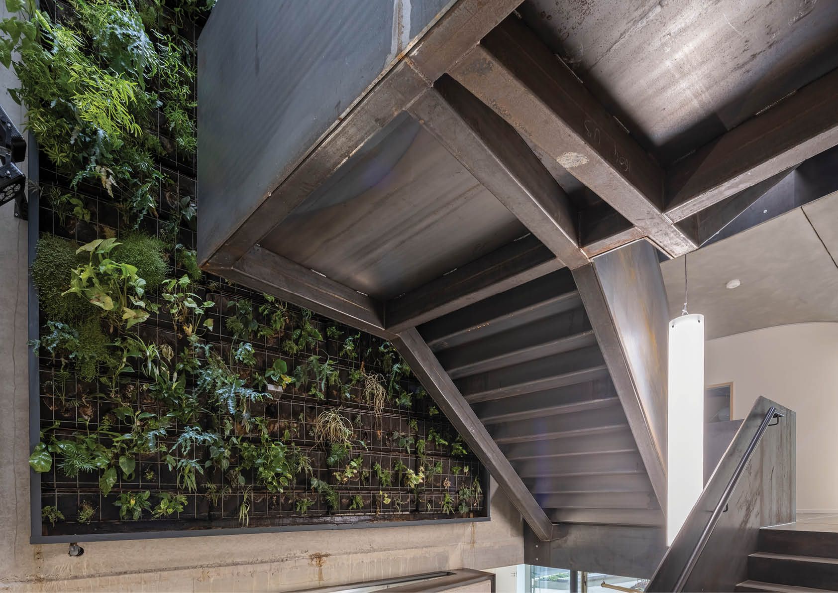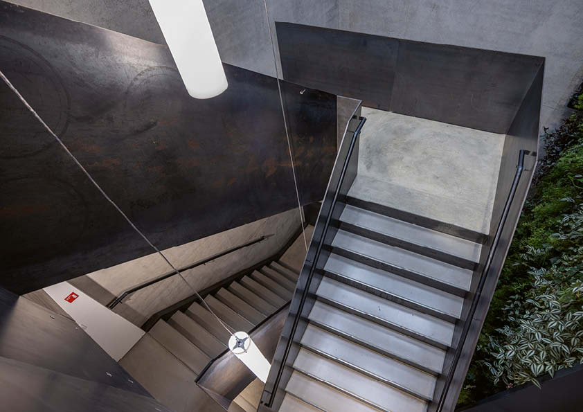 Toen dit ingenieursbureau besliste om zijn eigen kantoorgebouw te realiseren, wilde het een ontwerp dat aansloot bij het imago van de onderneming. Een ruwstalen trap, die als een verticale sculptuur in de lucht hangt, verbindt de verdiepingen met elkaar. Hij bestaat uit een structuur van rechthoekige buizen en stalen platen. In totaal is er 7,5 ton S235-staal verwerkt in deze structuur. De treden zijn zelfdragend van verdieping tot verdieping, met extra steunpunten bij de tussenbordessen. Het gaat om een volledig gelaste constructie. De treden en bordessen zijn bekleed met een gladde dekvloer. Deze laatste is gegoten over akoestische isolatie in een bak, die gevormd werd door de geplooide platen. Alle onderdelen van de trap bestaan uit onbehandeld ruwstaal, dat bijgevolg sporen van machinale bewerking en fabricage vertoont. Ook de roestsporen die na de montage zijn ontstaan, blijven zichtbaar en geven de trap een uniek patina.