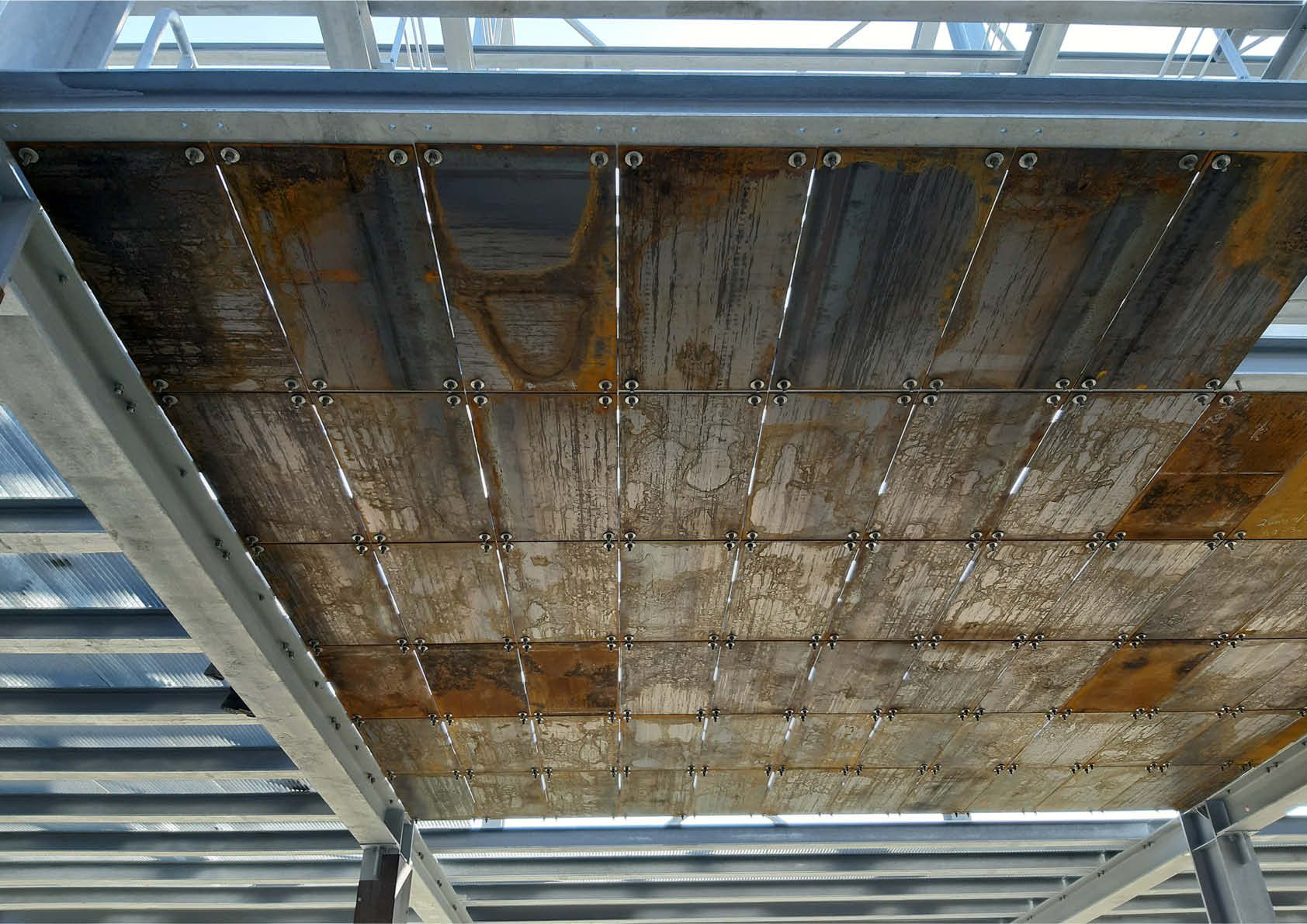 Om rechtstreeks contact tussen de vlammen en de constructie te verhinderen, werden de kritieke kolommen bekleed met beschermingspanelen van 5 mm dik weervast staal. In totaal werd zo’n 250 ton verzinkt staal gebruikt voor het nieuwe oefencomplex, circa 1100 m2 aan roostervloeren en 320 m2 aan beschermingspanelen van cortenstaal.